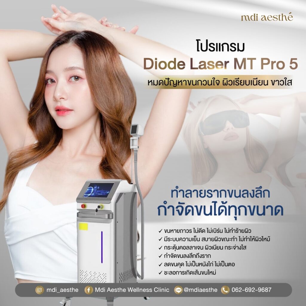 Diode MT hair removal It is a method of hair removal using laser waves converted into heat energy, sending energy down to the hair follicle cells. It enters the hair root, after which the hair root absorbs the heat energy. destroys melanin pigment and makes the hairs shrink down. and the hair will naturally fall out